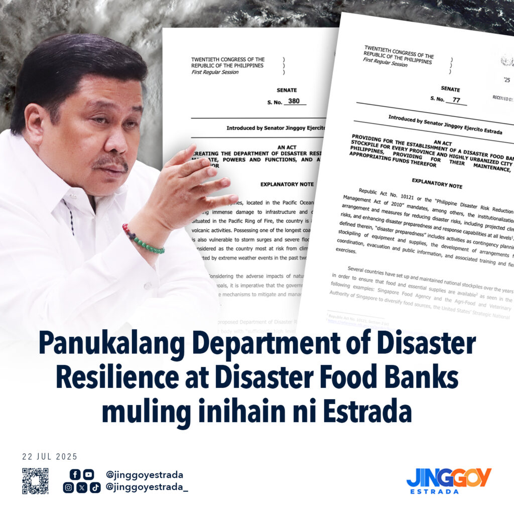 Among Estrada’s pet bills for the 20th Congress is the creation of a Department of Disaster Resilience (DDR) — an agency that will unify, strengthen, and streamline disaster preparedness, response, and recovery efforts — as well as the enactment of the Disaster Food Bank and Stockpile Act, which seeks to establish a nationwide network of food banks and relief supplies for swift deployment during emergencies.