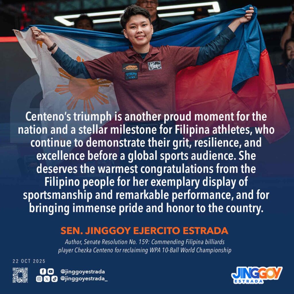 SENATOR Jinggoy Ejercito Estrada has filed a resolution commending Filipina billiards player Chezka “The Flash” Centeno for her remarkable victory in the 2025 World Pool Association (WPA) Women’s World 10-Ball Championship recently held in Bali, Indonesia.