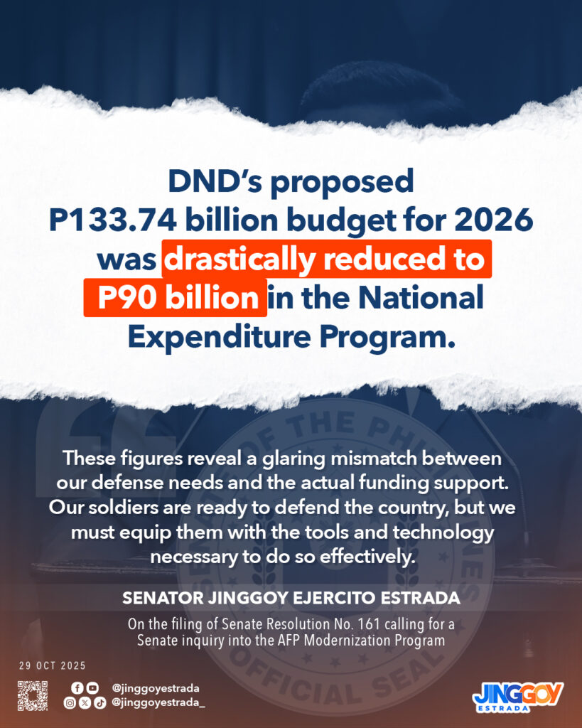 He lamented that the Department of National Defense’s (DND) proposed ₱133.74 billion budget for Fiscal Year 2026 was drastically reduced to ₱90 billion in the National Expenditure Program — ₱50 billion of which falls under unprogrammed appropriations, meaning its release will now depend on excess revenue collections and foreign grants.
