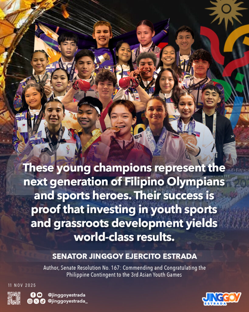FOR finishing 12th overall in the just-concluded Asian Youth Games 2025 in Bahrain with a total of 24 medals — seven gold, seven silver, and 10 bronze, Senator Jinggoy Ejercito Estrada is seeking commendation for the 141-strong Philippine delegation for delivering the country’s biggest medal haul and best-ever performance in the continental sports event.