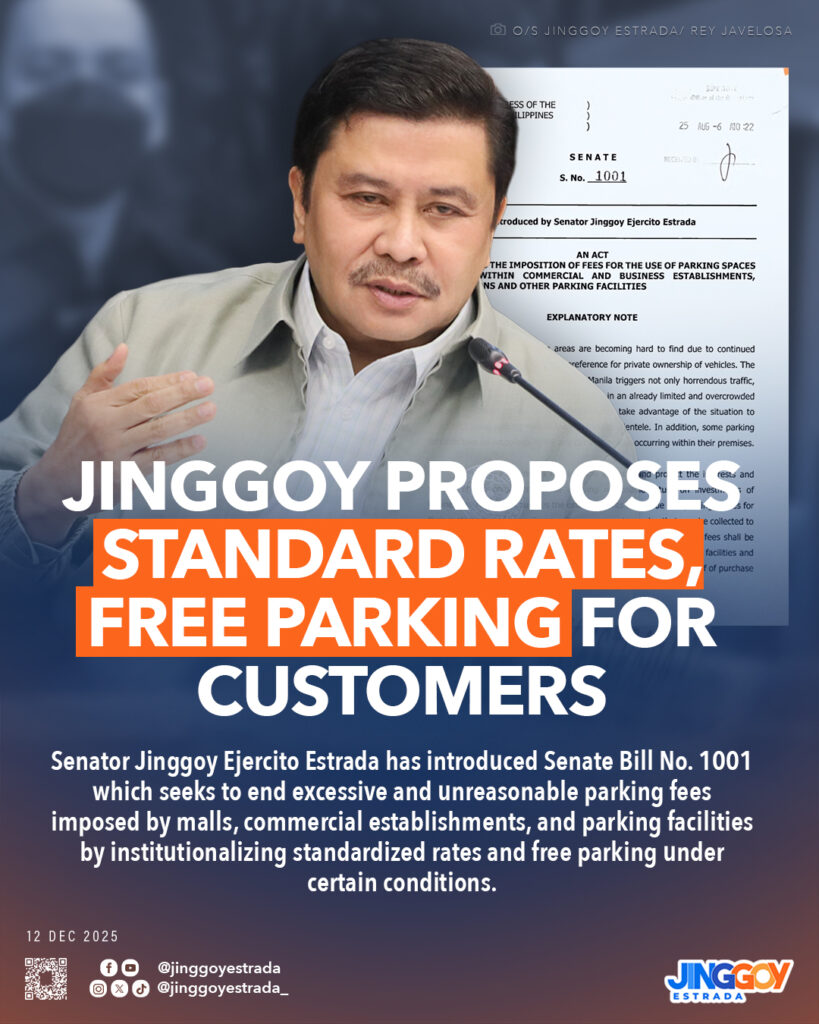 To promote fairness and protect consumers, Senator Jinggoy Ejercito Estrada has introduced Senate Bill No. 1001 which seeks to end excessive and unreasonable parking fees imposed by malls, commercial establishments, and parking facilities by institutionalizing standardized rates and free parking under certain conditions.