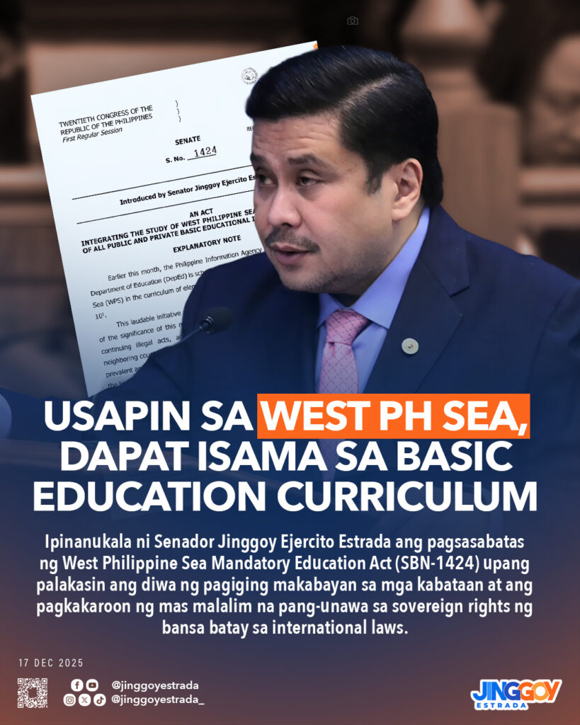 TO counter the spread of disinformation fueled by elaborate networks and to enlighten the younger generation about the importance of the country’s territorial rights and maritime domain, Senator Jinggoy Ejercito Estrada has proposed a measure mandating the inclusion of information on the West Philippine Sea (WPS) in the basic education curriculum.