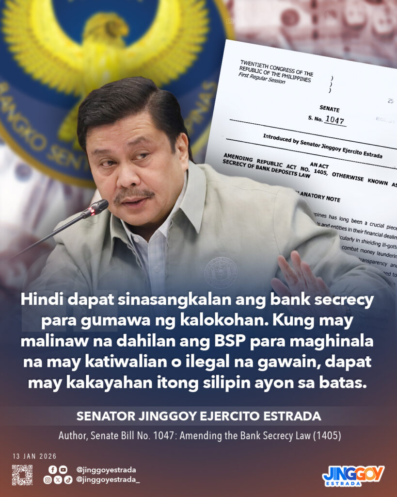 “Hindi dapat sinasangkalan ang bank secrecy para gumawa ng kalokohan. Kung may malinaw na dahilan ang BSP para maghinala na may katiwalian o ilegal na gawain, dapat may kakayahan itong silipin ayon sa batas,” ani Estrada.