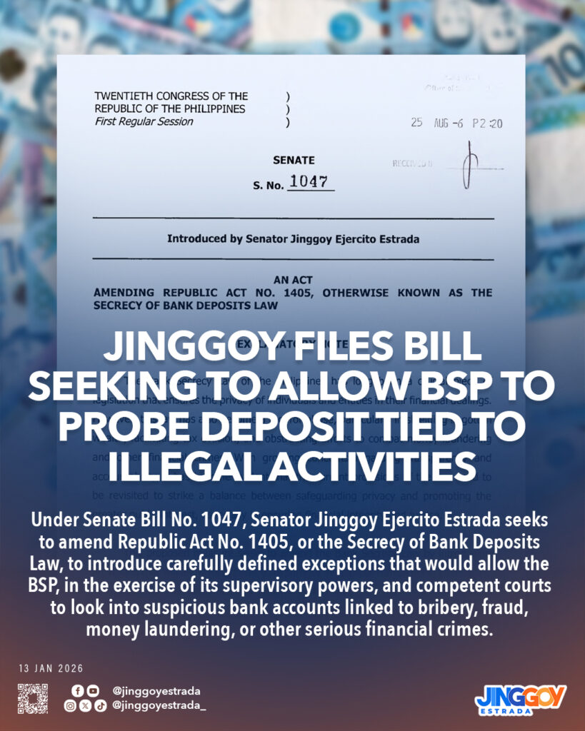 Under Senate Bill No. 1047, Estrada seeks to amend Republic Act No. 1405, or the Secrecy of Bank Deposits Law, to introduce carefully defined exceptions that would allow the BSP, in the exercise of its supervisory powers, and competent courts to look into suspicious bank accounts linked to bribery, fraud, money laundering, or other serious financial crimes.