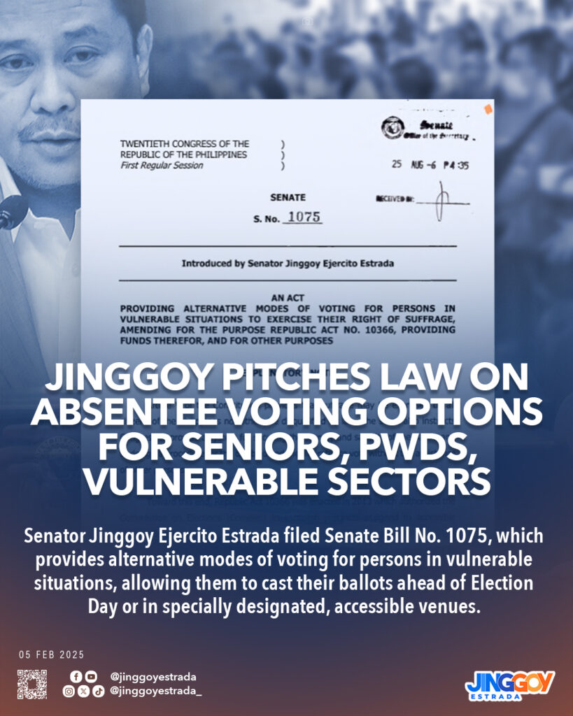 SENATOR Jinggoy Ejercito Estrada has filed a bill seeking to make voting more accessible for Filipinos in vulnerable situations, such as senior citizens, persons with disabilities (PWDs), pregnant women, internally displaced persons (IDPs), health workers on duty, and even repatriated overseas workers, by expanding local absentee voting and improving polling facilities nationwide.