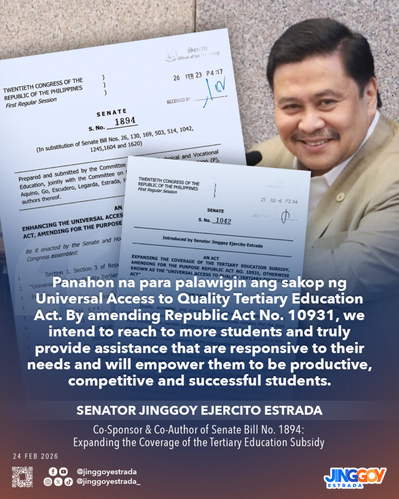 Inihain ng inyong lingkod ang Senate Bill No. 1042 upang palawigin ang sakop ng Universal Access to Quality Tertiary Education Act. By amending Republic Act No. 10931, we intend to reach to more students and truly provide assistance that are responsive to their needs and will empower them to be productive, competitive and successful students.