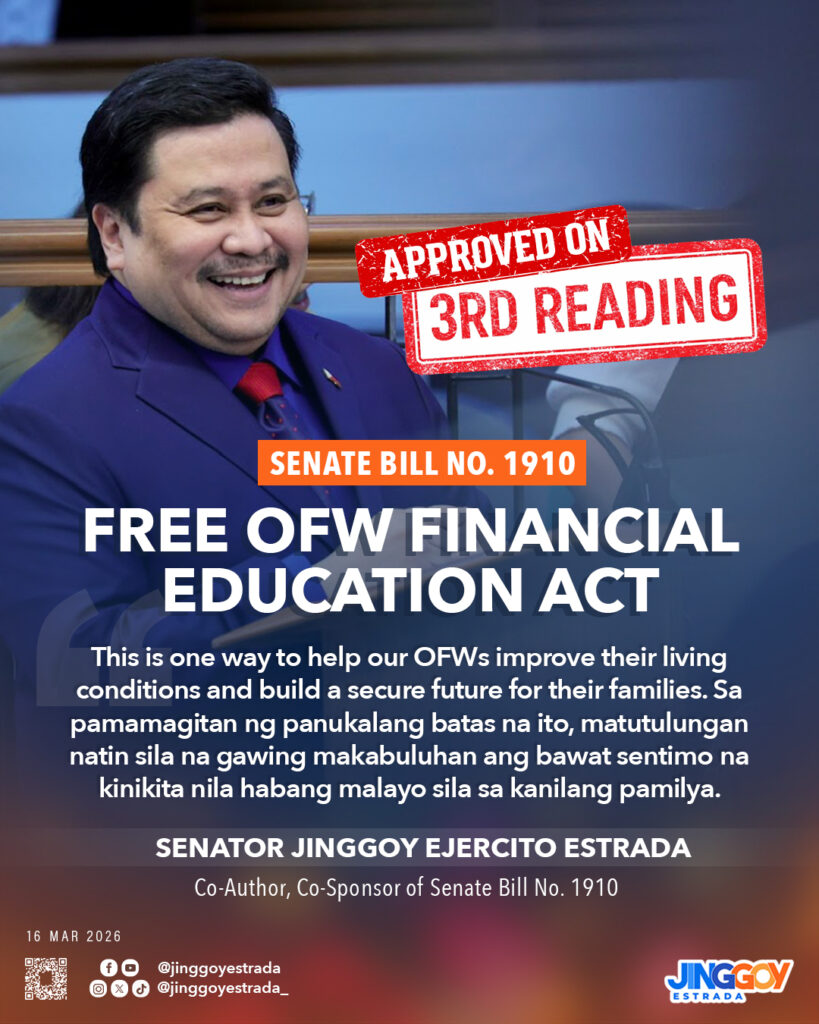 The “Free OFW Financial Education Act” brings together the concerned government agencies including the Department of Migrant Workers (DMW), the Overseas Workers Welfare Administration (OWWA), the Department of Finance (DOF), the Bangko Sentral ng Pilipinas (BSP) and the Securities and Exchange Commission (SEC) to provide free financial education or literacy training programs to the OFWs and their families or dependents.