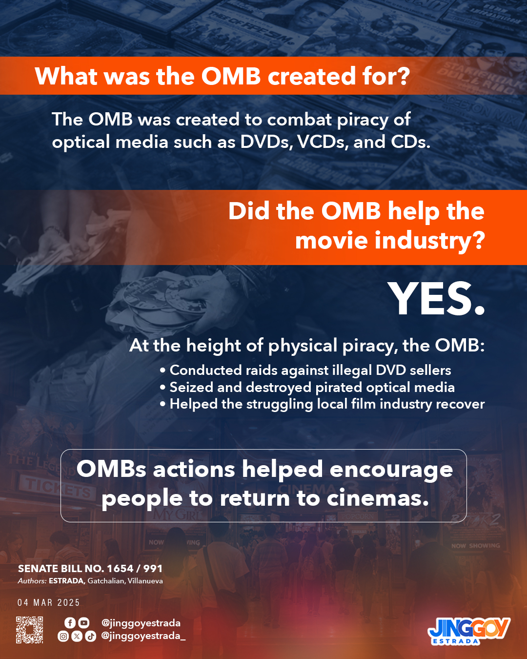 OMB had been at the forefront in the fight against film piracy, which significantly helped the recovery of the ailing local movie industry. Naalala po natin ang kanilang ginawang mga raid sa Quiapo, sa Divisoria, maging sa Greenhills, San Juan, at sa iba’t ibang bagsakan at mga pugad ng pirated DVDs at VCDs, gayundin ang kanilang pag-bulldozer at pag-wasak sa mga nakumpiskang kontrabando.