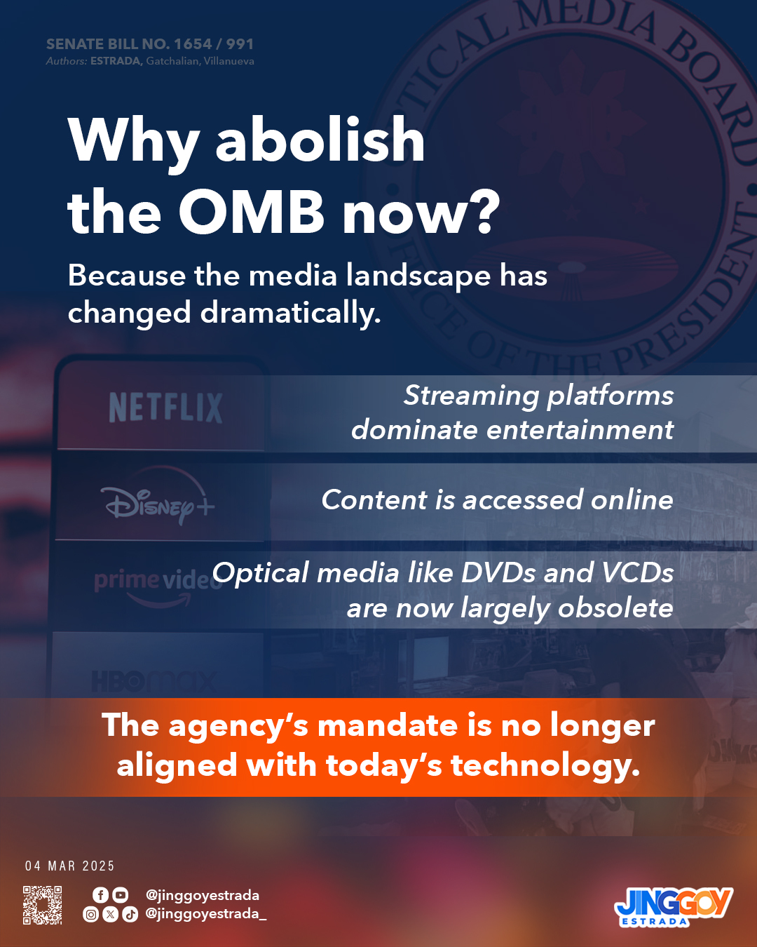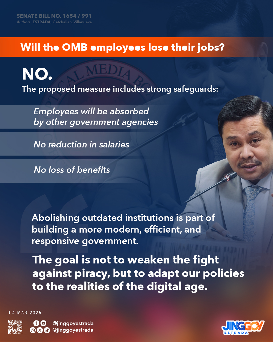 Bagama’t ipinapanukala natin ang tuluyang pagsasara o pagbubuwag ng OMB, hindi natin binibitawan ang problema ng pamimirata, na sa tingin natin ay nananatiling isang seryosong problema ng bansa. Sa pagtaya ng Intellectual Property Office of the Philippines (IPOPHL), posibleng umabot sa isang bilyong dolyar ($1 billion) ang nawalang kita para sa taong 2025 dahil sa video piracy.