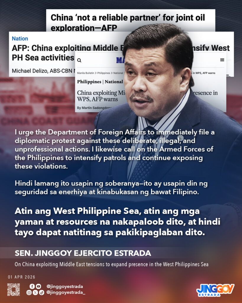 Multiple studies indicate that the West Philippine Sea holds significant untapped oil and natural gas resources. Any attempt to exploit the situation—at a time when global attention is focused on the ongoing conflict in the Middle East—not only undermines our sovereignty, but also threatens regional security and the rules-based international order.