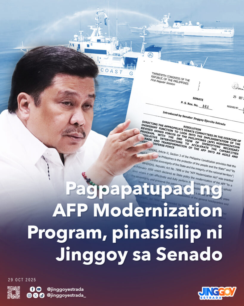 Sa gitna ng patuloy na tensyon sa West Philippine Sea, mga insidente ng pangha-harass sa mga mangingisdang Pilipino at tauhan ng maritime agencies, pati na rin ang lumalaking banta sa cyberspace, naghain si Senador Jinggoy Ejercito Estrada ng isang resolusyon na nananawagan sa Senado na atasan ang mga kaukulang komite na gamitin ang kanilang oversight functions upang busisiin ang pagpapatupad ng Armed Forces of the Philippines (AFP) Modernization Program.